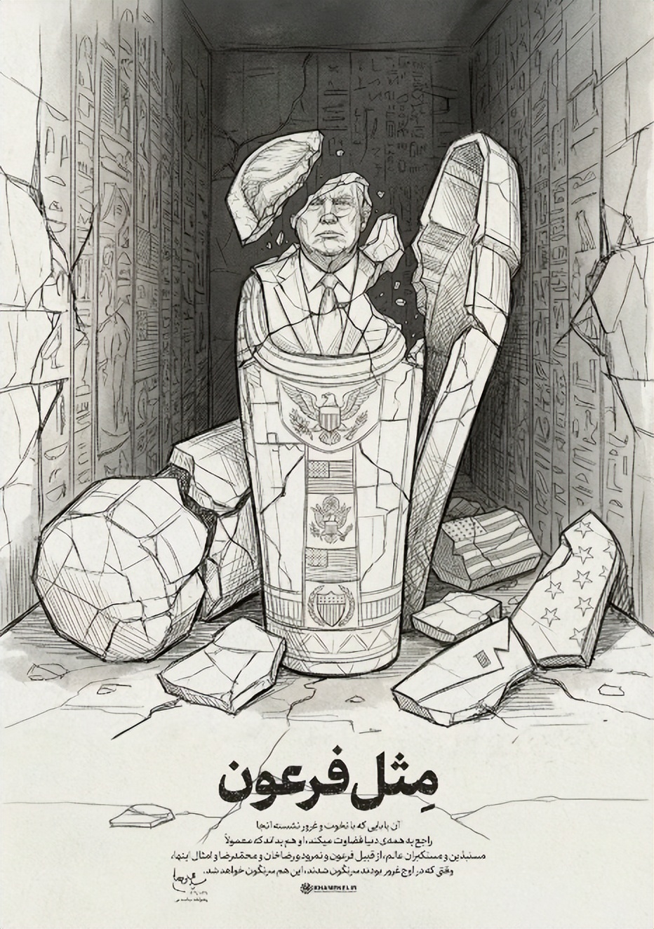 伊朗的最高领袖哈梅内伊,近日在社交平台上发出了一张耐人寻味的图片,他将美国总统特朗普描绘成一个正在破碎的古埃及石制棺椁,并配文写道: