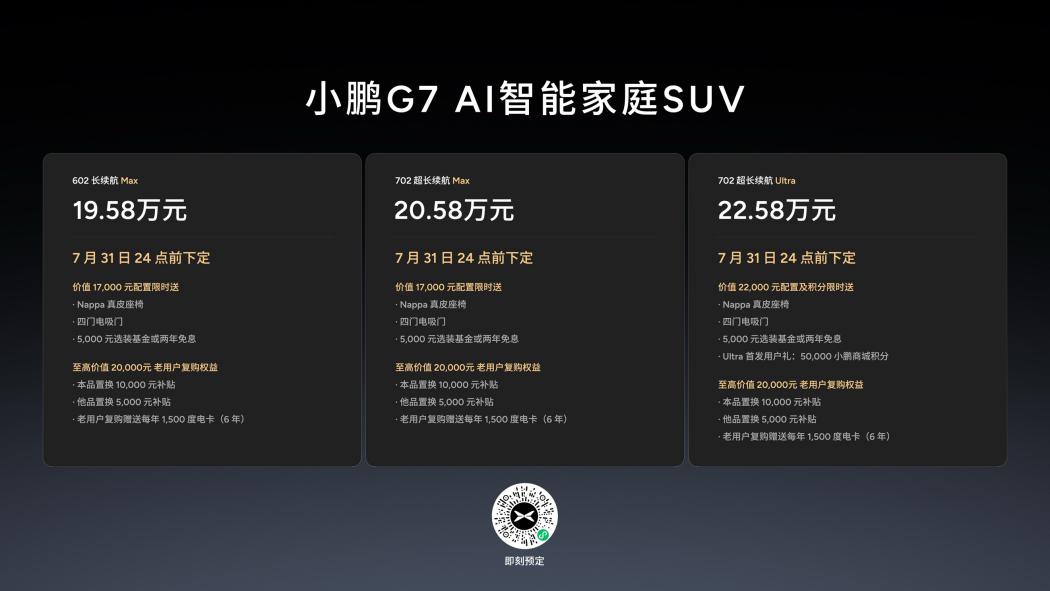 今日,小鹏汽车正式发布全新AI智能家庭SUV——小鹏G7。新车共推出602长续航Max、702超长续航Max、702超长续航Ultra三个版本,官方指导售价分别为19.58万元、20.58万元和22.58万元,上市即刻可以交付。小鹏G7带来了无忧礼、交付礼、置换礼、复购礼等多重上市权益,在7月31日24点前下订,可获得价值8000元Nappa真皮座椅、价值4000元前/后排静音电吸门、一年智能辅助驾驶安心服务、5000元选装基金或两年免息金融方案,下订Ultra版还可额外获得50000小鹏商城积分。此外,老用户复购还有至高20000元超值权益。