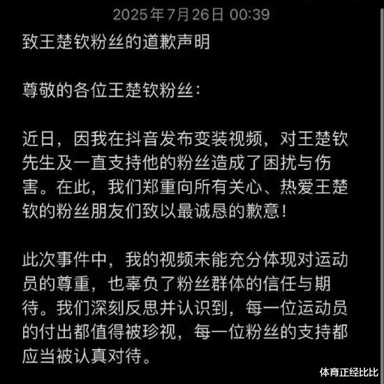 因发布变装视频,对王楚钦先生以及一直支持他的粉丝造成了困扰与伤害。向所有关心、热爱王楚钦的粉丝朋友们致以最诚恳的歉意。