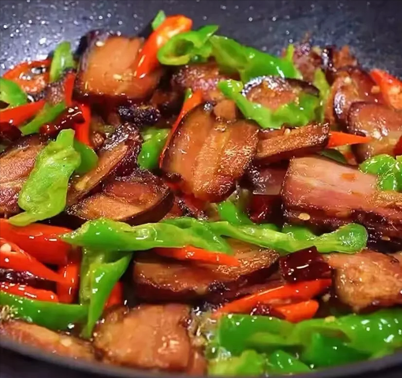 3️⃣炒腊肉放青椒、炒芹菜放木耳、拌菠菜放花生米