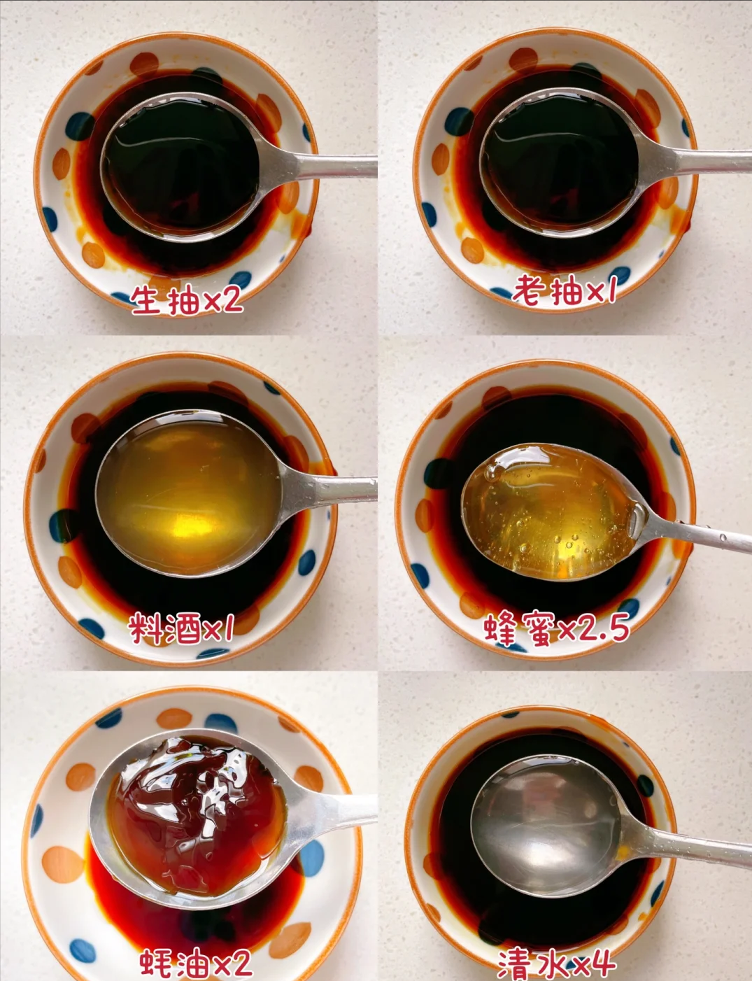 照烧汁:生抽、老抽、料酒、蜂蜜、蚝油、清水,比例看下图: