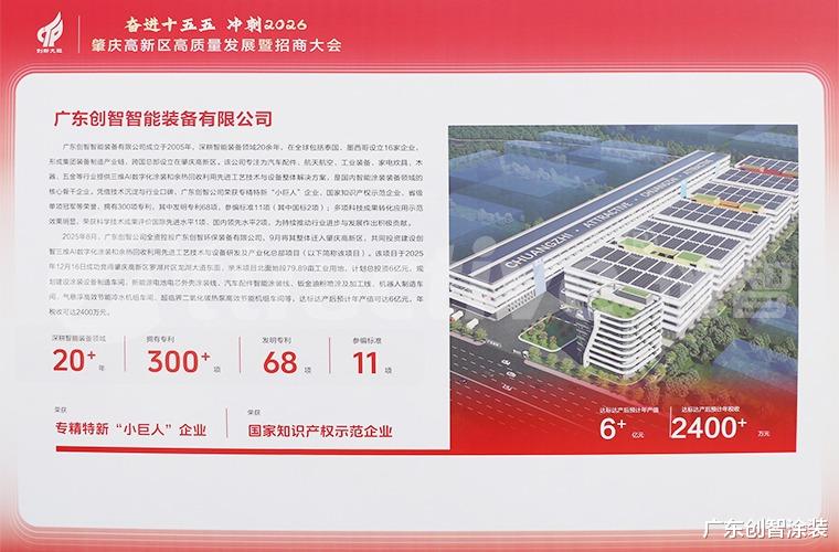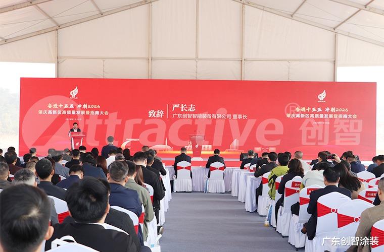 “奋进十五五·冲刺2026”!在肇庆高新区高质量发展暨招商大会的舞台上,广东创智智能装备有限公司有幸作为大旺高新区优秀企业代表发言。创智深耕智能装备领域20余年,以其扎实的技术沉淀与行业领先的技术实力,擘画肇庆区域深度布局的战略蓝图,助力区域产业协同升级,成为大会关注的焦点之一。作为国内智能涂装装备领域的核心骨干企业,正以创新为笔、实干务实的奋进精神,在肇庆高新区的沃土上书写高质量发展的新篇章。