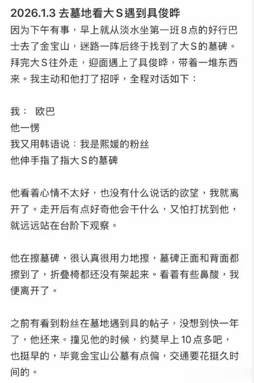1月4日,有网友称昨日在台北金宝山墓园偶遇具俊晔,具俊晔见到大S墓碑后便专注地擦拭,自大S离世后,他长期坚持前往墓园陪伴。