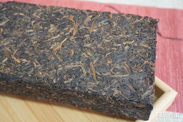 砖面黑褐油亮,芽头已经转为金黄色。茶砖压制得非常松,可以很轻松用手掰下条索,能看出条索相对完整,与大益下关等惯用的碎切条索不同,勐库戎氏这一项制茶工艺很加分。