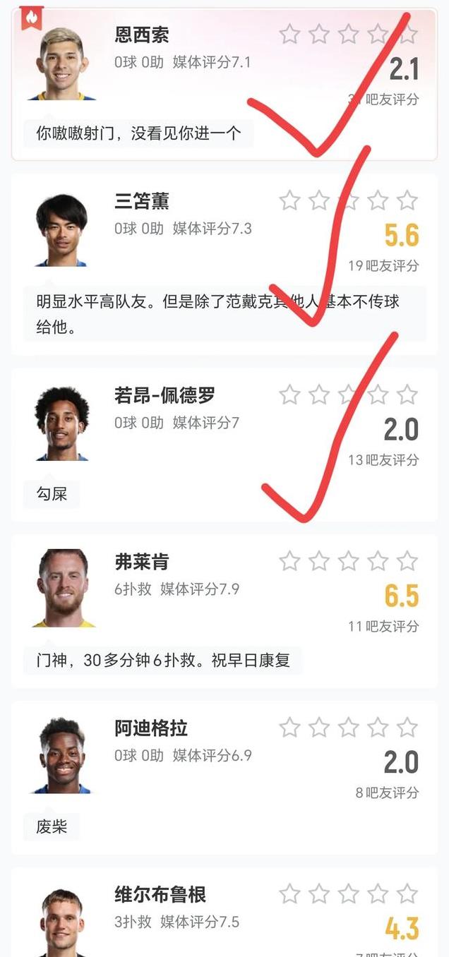 在赛后的球员评分中,布莱顿基本所有球员都被打出了超级低分,三沾薰被打了5.6分,前锋佩德罗和恩西索更是只有2分的低分!