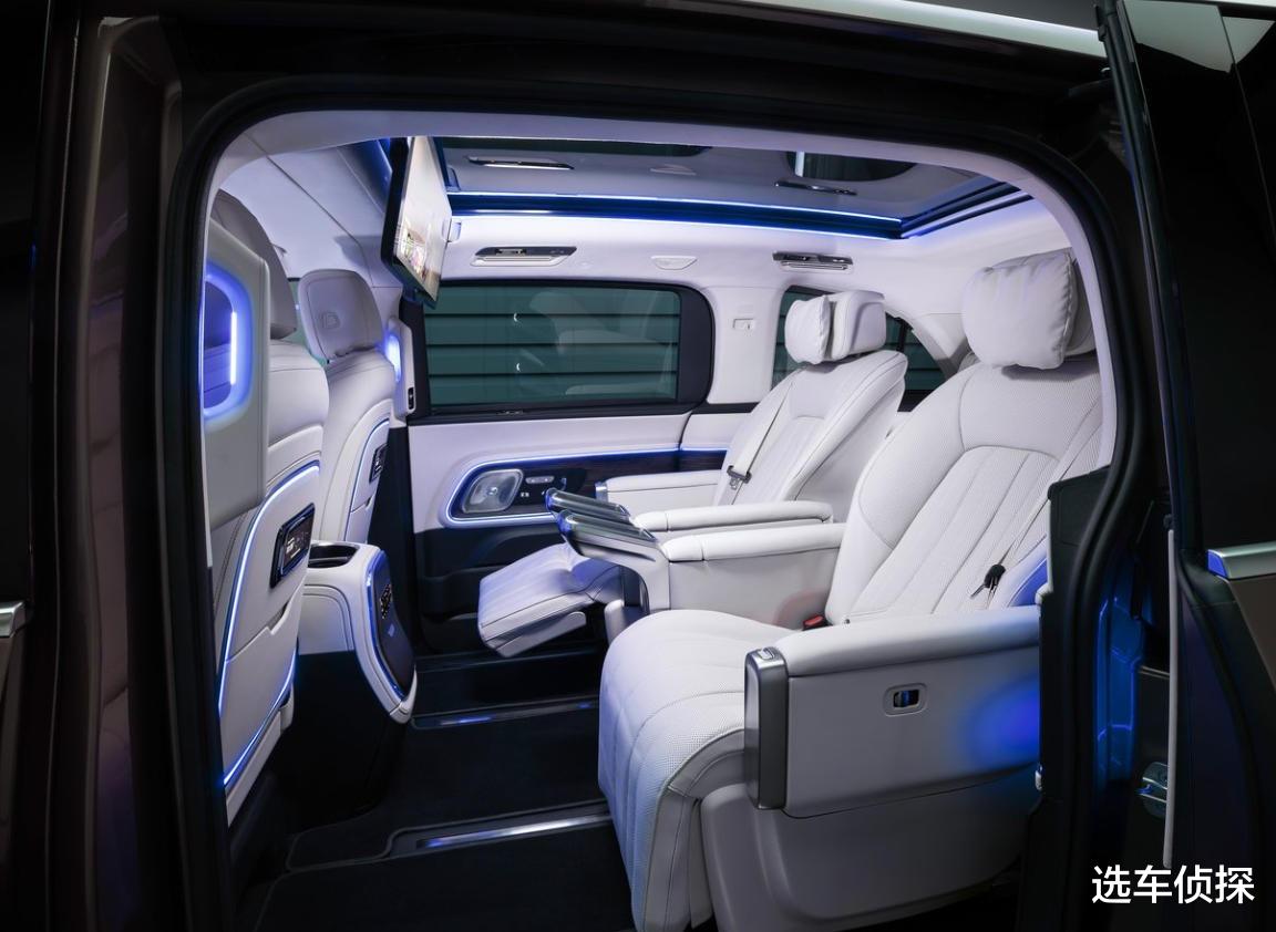 奔驰V级提供标轴(3200mm轴距)和长轴(3430mm轴距)版本,标配7座,第二排配备电动座椅,支持电动前后和靠背调节,带无线充电功能,中央扶手箱可选装冷藏冰箱,基本能满足商务接待的需求。但受限于老旧的平台设计,V级的座椅配置和灵活性存在短板:第三排空间腿部局促,座椅没有舒适性配置,也没有奔驰主打的氛围灯,座舱的豪华感和体验感不如同价位豪华MPV,许多厂家采购丐版车型,进行改装,从侧面反映出原厂V级的不足。