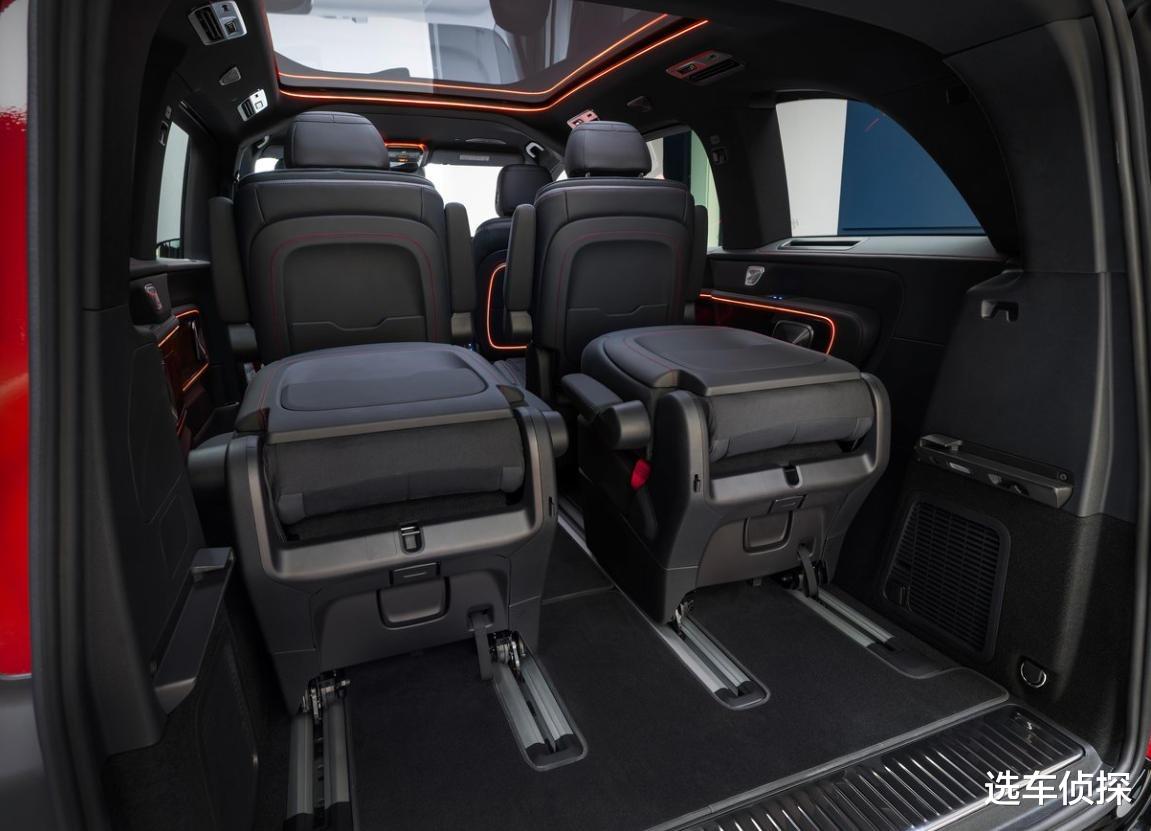 奔驰VLE就像原厂改装后的V级,有手动座椅和电动座椅 版本,手动座椅自带四组集成滚轮,可前后移动、任意锁止,还能直接拆卸,推到车库,改成拉货的货舱;电动座椅支持车机、手机APP远程调节,还预设了行李、行政、人货兼顾、标准四种模式,可一键调整座椅布局。