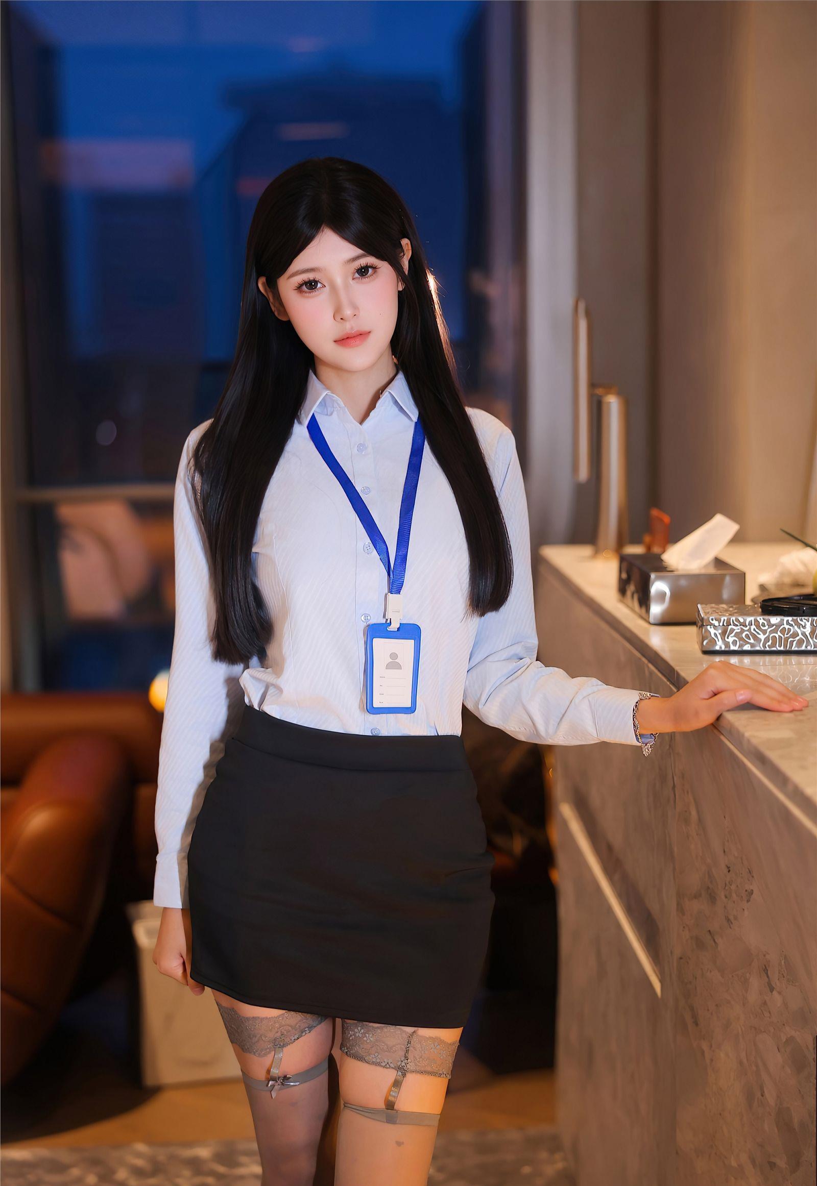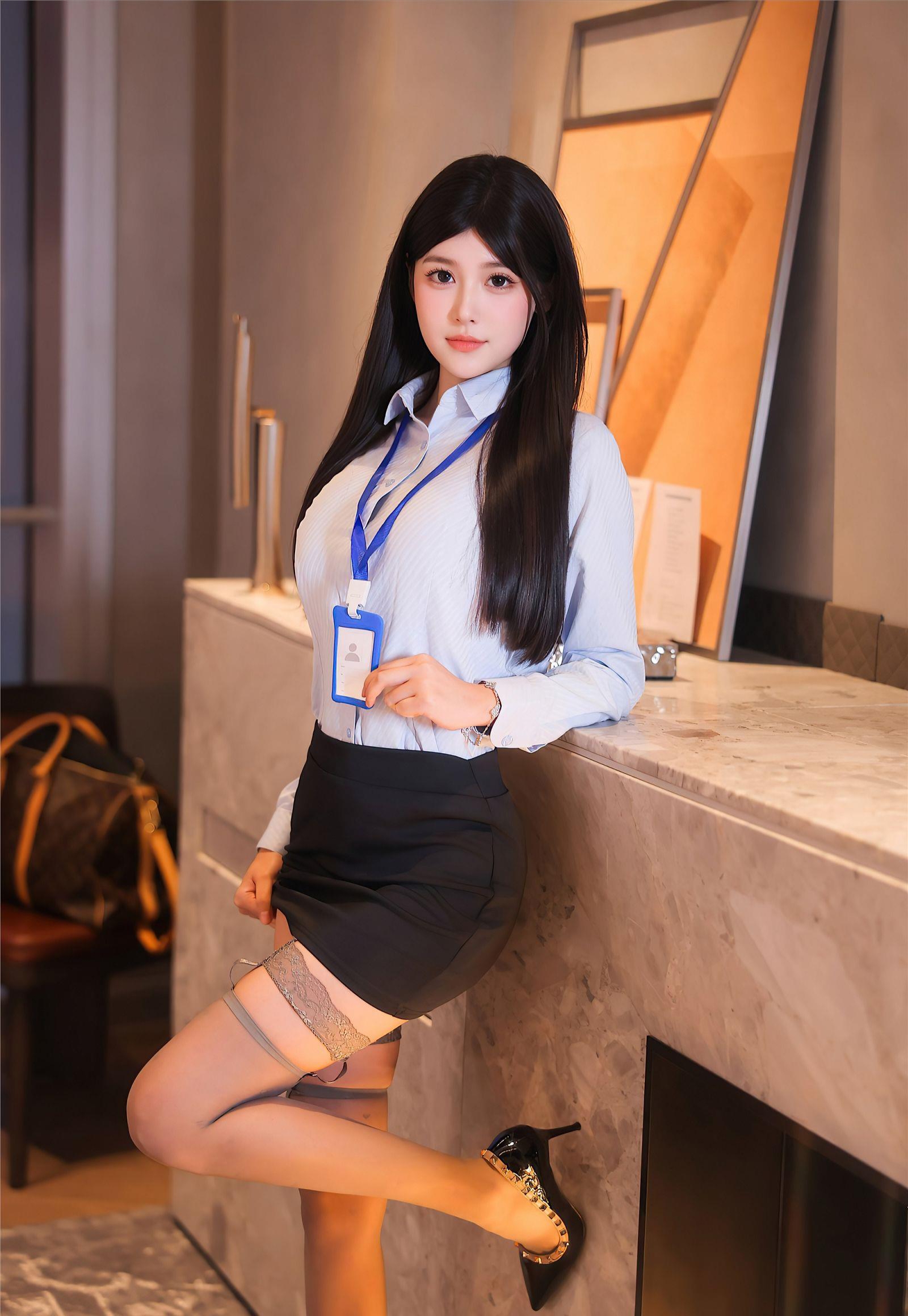 身着浅蓝衬衫与黑色短裙,配以蕾丝丝袜与高跟鞋,干练优雅。她单腿轻踏台面,姿态从容。乌黑长发垂落,胸前工作牌点缀。背景置物