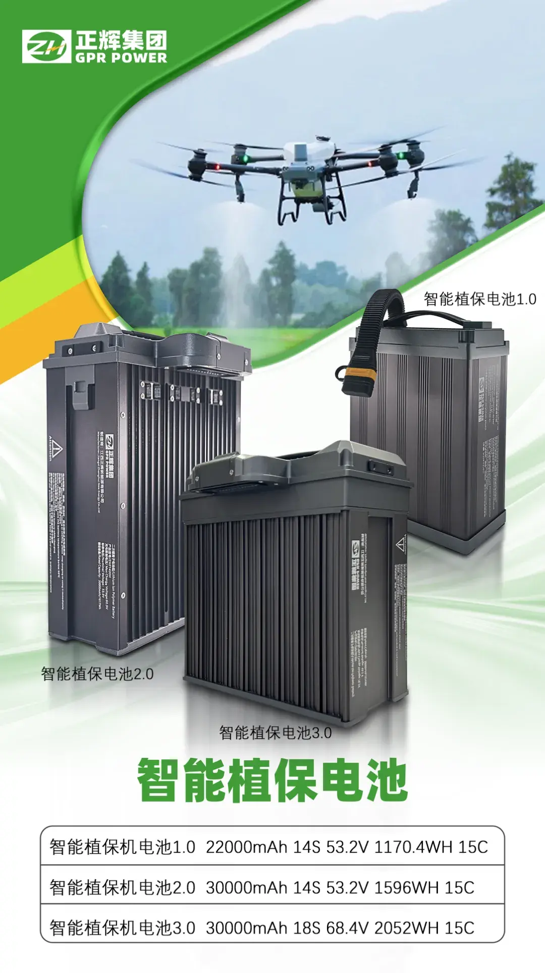 植保智能电池1.0/2.0/3.0系列,精准覆盖从入门到旗舰的全场景作业需求,针对高强度、高频率的连续喷洒作业优化,以稳定可靠的电力和持久的循环寿命确保农时效率。