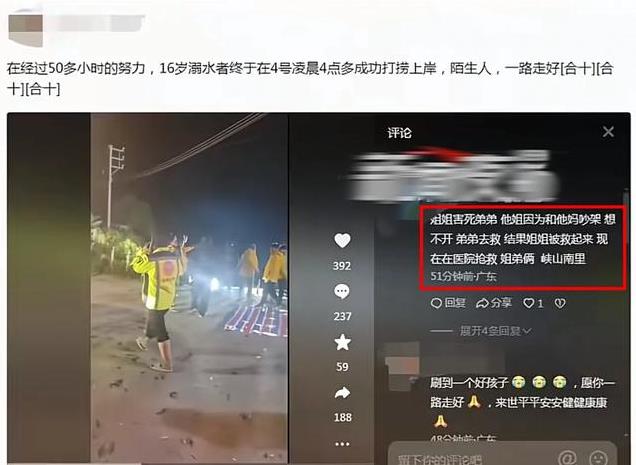 据了解,弟弟跳河救姐姐后溺水失踪,4号下午,一名救援队员回应:“一月一?日?晚接到家属求助后?,潮南区两个救援队,五?六?十?名队员参与救援,(4日凌晨)4点?多?才捞到的,搜寻的五十多个小时。”弟弟为了救姐姐,跳河?溺亡? 1号失踪,直到10号凌晨4:00左右才打捞起男生的遗体, 这回父母和女儿的矛盾一辈子都解决不了了!
