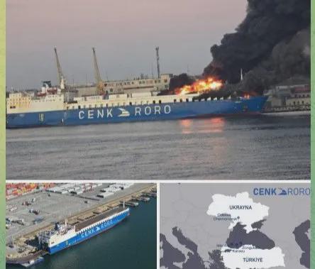 当时该货船停靠在了位于敖德萨州的切尔诺莫斯克港,运营商表示,这艘名为“CENK T”的滚装船,当天到岸不久就遭遇到了导弹和无人机的袭击,并因此起火。