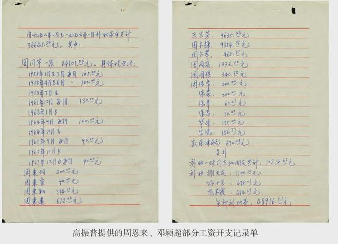 七伯的卫士、后来任七妈警卫秘书的高振普,把他保存的最后一份工资单送给我们举办的“缅怀周总理珍品展”展出。他说:“周总理的工资每月人民币400 元8 角,邓大姐的工资每月347 元5 角。从1958 年到1976 年,两人工资共16 万多元。其中近5 万元补助亲属和工作人员。邓大姐说:这样做,既解决了他们的实际困难,也给国家减轻了负担。另外决定,多余部分,凡够5000 元就交党费。周总理1976 年去世时,两人总共积蓄5100 元,所余积蓄都交了党费。”
