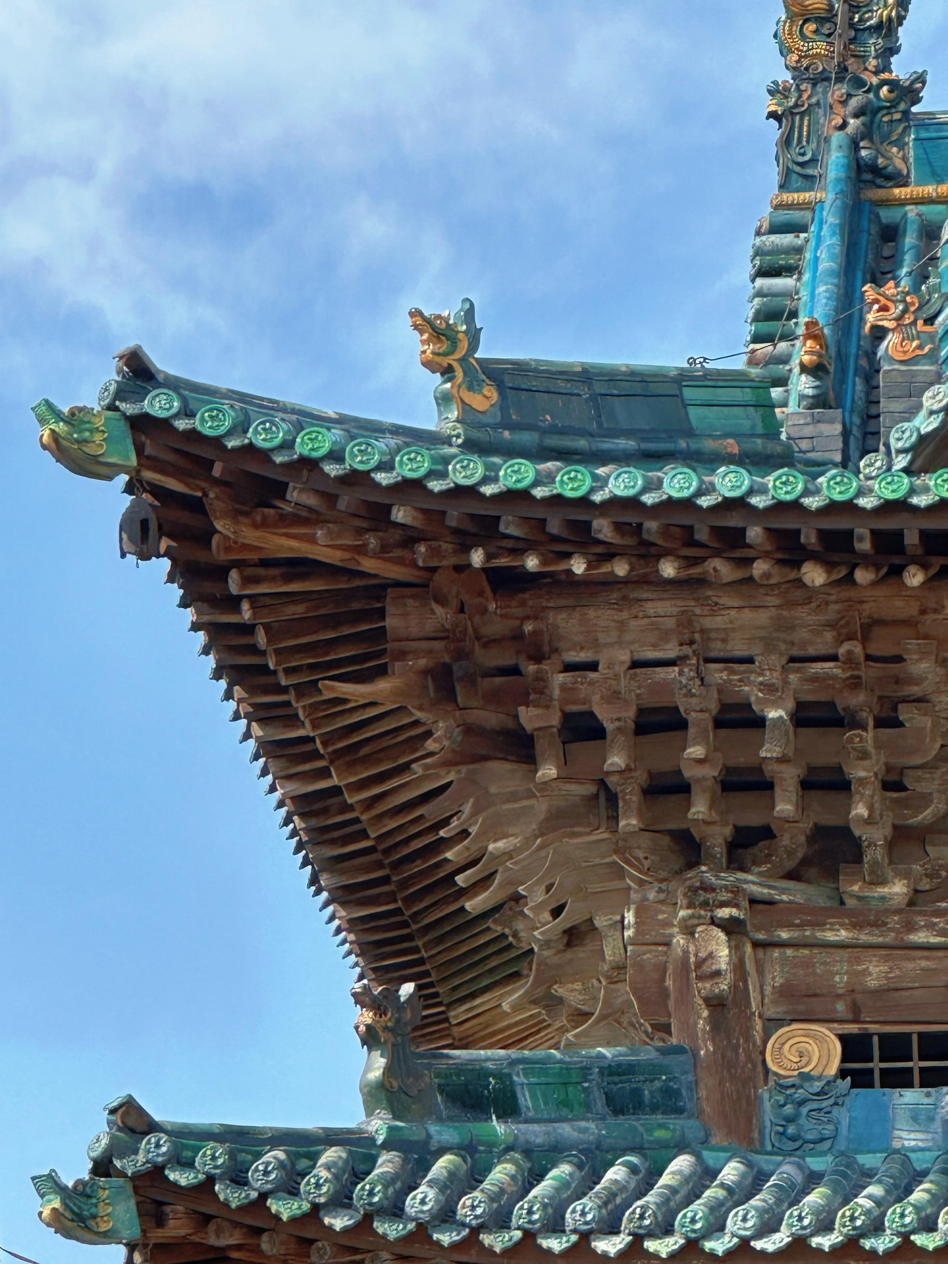 最有意思的是清康熙五十三年的那次维修,工匠们大概是觉得前人的设计还不够花哨,居然在二层平座外缘挂上了黄色琉璃云板。要知道,在等级森严的清代,黄色琉璃可不是随便能用的物件。这云板至今还在,风吹过时会发出嗡嗡的颤音,像极了当年工匠们偷偷摸摸完成这项"越制"工程时的心跳声。有人说这是当地乡绅捐钱时耍的小聪明,想借皇家专用色抬高镇子的身价;也有人说根本是工匠们自己的恶作剧,反正山高皇帝远,给楼戴个"黄帽子"图个吉利。每次路过抬头看那些泛着冷光的云板,总觉得能看见几百年前匠人们躲在柱后偷笑的影子。