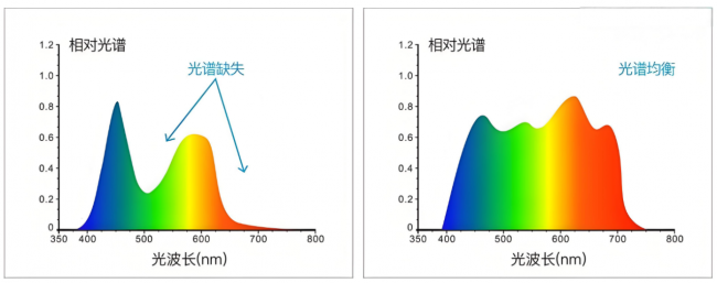 我们的眼睛是在自然光(太阳光)下进化了数百万年的,自然光的光谱是连续、饱满且均衡的。普通LED灯,尤其是早期的白光LED,为了追求高亮度和低成本,其光谱存在严重“偏科”和“断层”: