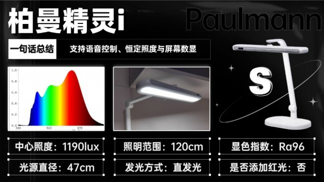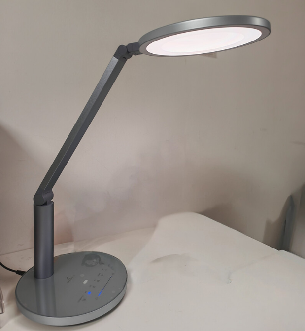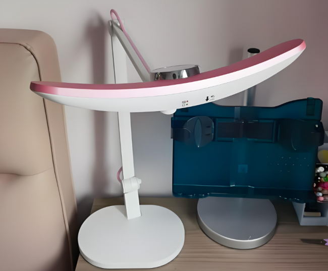 柏曼精灵i整体走稳重实用路线,全金属机身带来不错的质感与稳定性,47cm发光面采用直发光方案,中心照度充足,满足国AA级标准,可覆盖1.2米左右桌面。它支持语音控制、恒定照度与屏幕数显,操作直观易懂。但因为是直发光结构,光线相对集中,在某些角度下仍会有轻微眩光,加上整体偏重,调节与移动不算灵活,更适合固定位置长期使用。