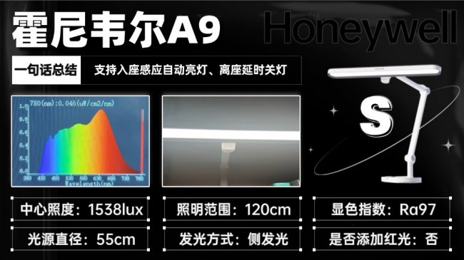 霍尼韦尔A9采用55cm的长条形灯头,照明范围较广,可覆盖约1.2米宽的桌面,适合大书桌或需要宽幅照明的场景。它采用全光谱光源,显色指数Ra97,色彩还原表现不错。操作上结合了旋钮与自动感光,支持入座亮灯,体验较为便捷。它的短板在于,护眼策略主要停留在满足基础标准(如国AA照度、RG0蓝光)的层面,并未引入更深入的光谱调控或红光养护技术。同时,灯体体积较大,会占用较多桌面空间。以其定价而言,在核心护眼性能上相比同价位的专业品牌产品优势不明显,性价比一般。