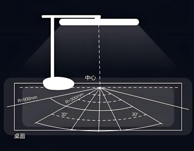 • 照度(亮度):国标将读写台灯分为A级和AA级。 • 国AA级要求:在以灯头投影为圆心、半径为30厘米的扇形区域内,照度不低于500勒克斯(lx);在半径为50厘米的扇形区域内,照度不低于250勒克斯。这确保了核心区域的亮度足够,预防因光线昏暗导致的视物费力。 • 均匀度(光线分布):这是指照射区域内,最大照度与最小照度的比值。这个值越接近1,说明光线分布越均匀。国标对均匀度也有要求(AA级≤3),但这只是最低门槛。一台优秀的护眼灯,其均匀度会做得更好。