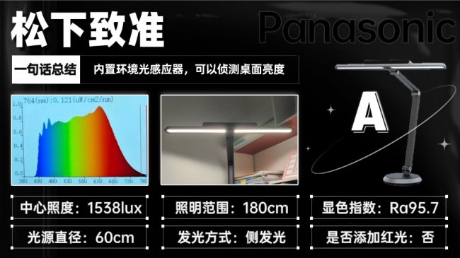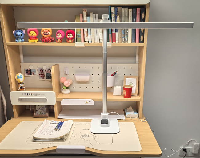 核心亮点:47厘米的发光面结合直发光设计,中心照度达1190lux,能覆盖约120厘米宽的桌面,满足日常读写照明需求