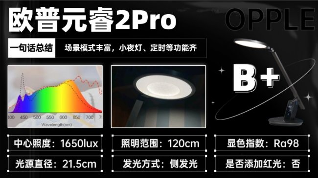 欧普元睿2Pro最大亮点是智能体验,支持APP与语音控制,场景模式丰富,小夜灯、定时等功能齐全,日常使用便利性高。光源亮度与均匀度满足日常学习需求,但光学调校偏基础,在高亮模式下对光线敏感人群不够友好,长时间使用舒适度一般,整体属于“功能多、护眼中等”的实用型选择。