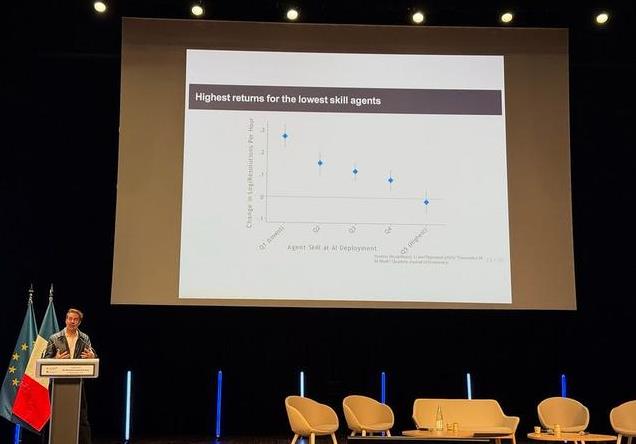 Erik Brynjolfsson在演讲的开头深入探讨了人工智能对现代工作场所的变革性影响,并以呼叫中心作为一个引人注目的案例研究。他的研究表明,人工智能工具(尤其是大型语言模型)的引入推动了生产力的快速增长。例如,在呼叫中心,使用人工智能助手的员工能够更快地解决查询,即使在人工智能中断期间,通话时长等性能指标也恢复到了人工智能之前的平均水平。有趣的是,Brynjolfsson 指出,表现最差的代理经历了最显著的改进,而表现最好的代理只获得了微不足道的收益。这种传统生产力趋势的逆转尤其引人注目,因为从历史上看,技术被视为最熟练工人的辅助手段。然而,有了人工智能,即使是最不熟练的工人也能获得不成比例的收益,这表明技术正在以意想不到的方式让竞争环境变得公平。