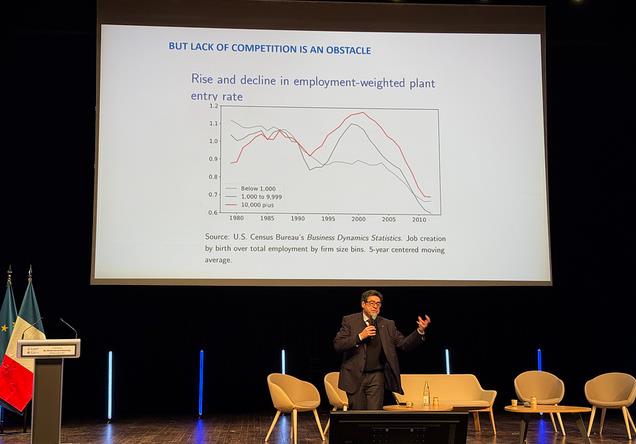 阿吉翁最引人注目的观点之一是,他强调竞争不仅在推动创新方面发挥着作用,而且在推动公平方面也发挥着作用。他展示的数据表明,尽管自 2012 年以来,人工智能专利数量呈爆炸式增长,但由于缺乏竞争多样性,这些创新的质量和可及性受到了阻碍。在少数主导者控制市场的行业中,创新生态系统有可能自我强化,新进入者挑战现状的机会更少。阿吉翁呼吁制定严格的竞争政策,这提醒我们,技术进步必须与制度变革相结合。如果没有旨在打破垄断结构的政策,人工智能实现生产力民主化和刺激经济增长的承诺可能会受到严重破坏。