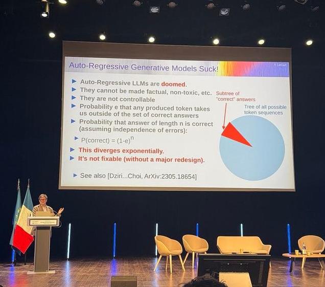 Yann LeCun 是深度学习的创始人之一,也是 Meta 的首席人工智能科学家,他在主题演讲中既批判了人工智能的现状,又展望了人工智能的未来蓝图。他的观点明确而发人深省:“自回归法学硕士注定要失败。”他认为,虽然自回归模型取得了显著的进步——尤其是在自然语言处理方面——但它们对下一个单词预测的依赖使它们从根本上无法捕捉现实世界的复杂性。
