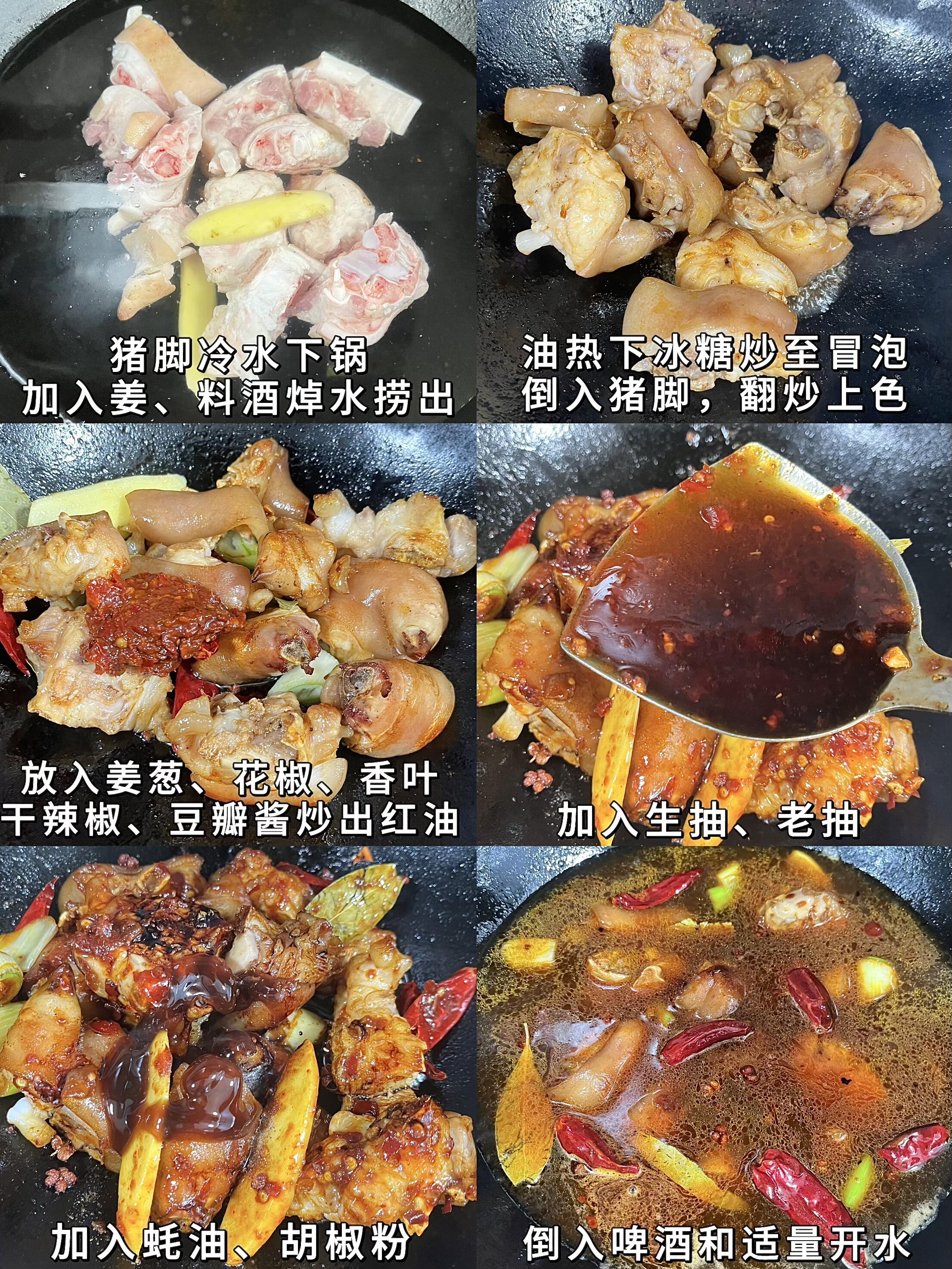 3.配料:葱、姜、蒜适量,用于去腥增香;八角2 - 3颗、桂皮1小块、香叶2 - 3片、花椒一小把等香料,这些香料能为猪脚增添丰富的风味;冰糖10 - 15颗,用来炒糖色,使猪脚色泽红亮;料酒2 - 3勺、生抽3 - 4勺、老抽1 - 2勺、蚝油1勺,这些调味料能赋予猪脚鲜美的味道;盐和鸡精适量,用于最后调味。