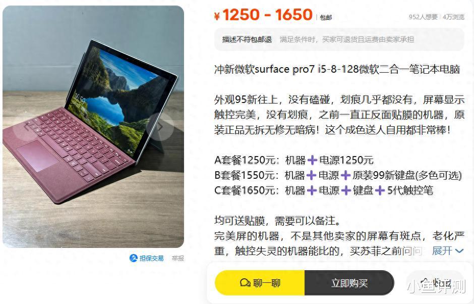 这几天在二手鱼上刷得有点魔怔了。本来只是想找个便宜的备用机,结果越刷越上头,最后盯上了一个卖Surface Pro 7的。1250块,i5 10代处理器,8G内存,128G硬盘,卖家说成色95新以上,屏幕完美没瑕疵,无拆无修。说实话,这个价格看得我心里直痒痒。