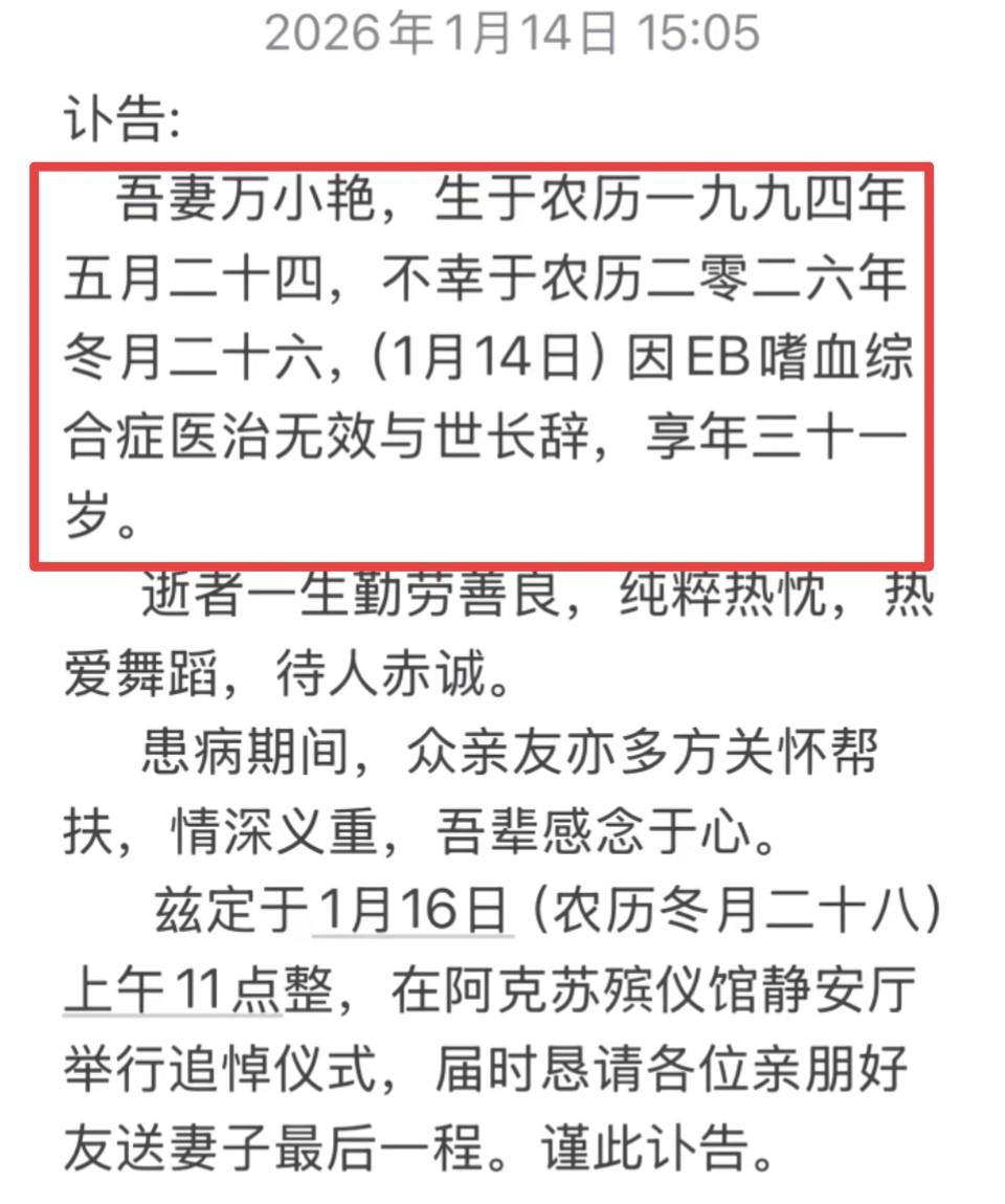 在人们期待着一切如常的日子里,疾病像潜伏在身边的暗礁,随时可能撕裂生活的平静。1月14日,新疆一位网友在社交平台发布了令人心碎的消息——他的妻子万小艳因罕见的EB嗜血综合症离世,只留下31岁的青春定格在那个寒冷冬日。这个消息像石子投入湖面,激起了无数共鸣与难以消化的痛感:人生并没有“来日方长”可言。