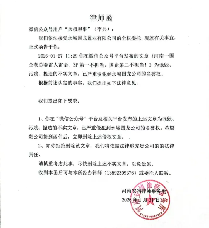 律师函称,我在公众平台发布的《河南一国企老总曝雷人雷语:ZF第一不担当,国企第二不担当!》为诋毁、污蔑、捏造的不实文章。