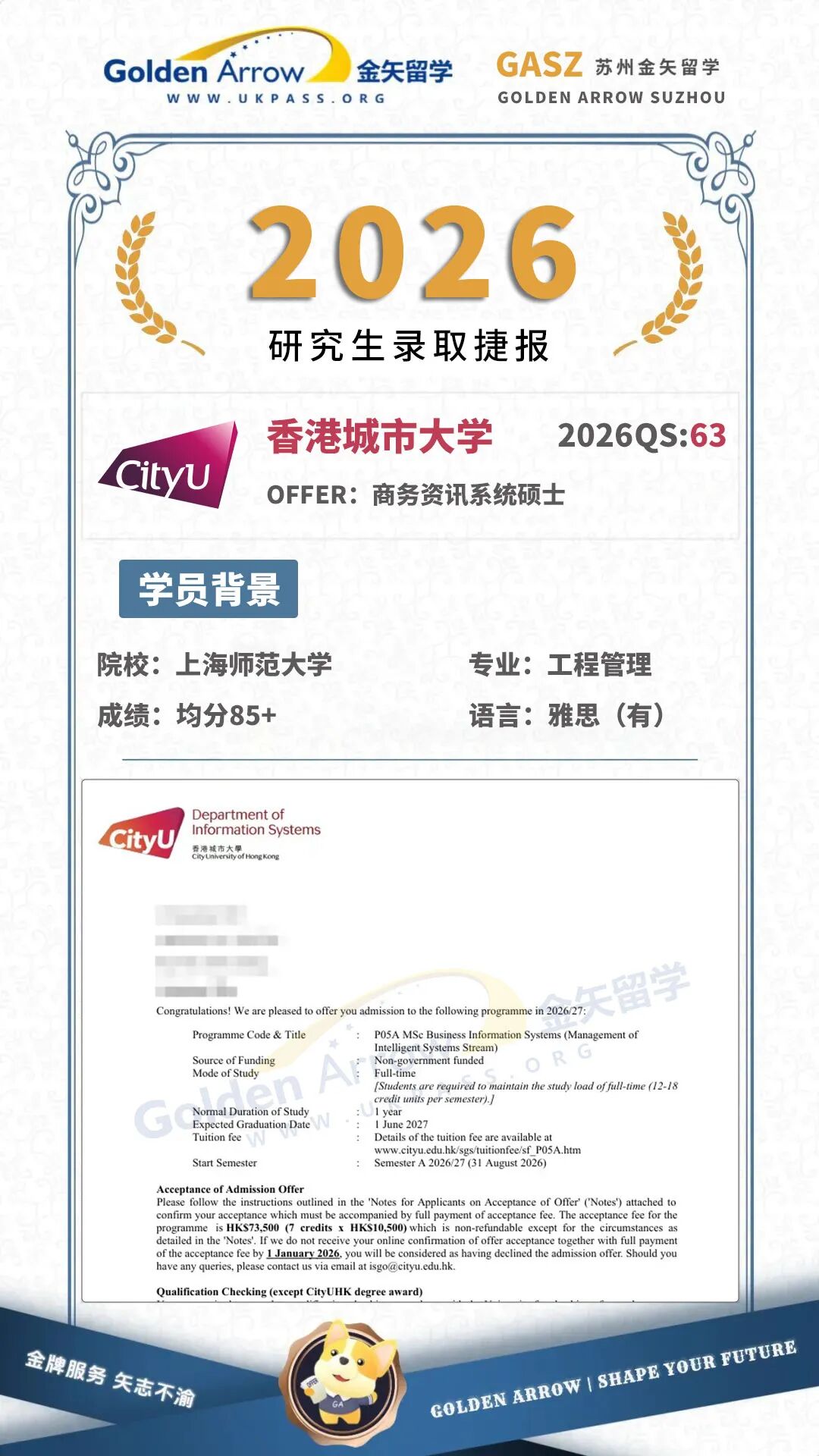 香港城市大学申请案例:上海师范大学工程管理专业的同学,以均分85+有雅思的背景,通过金矢留学成功申请到了QS世界大学排名位列第63位的中国香港城市大学商务资讯系统硕士,下面就给同学们介绍一下该专业课程及录取offer!