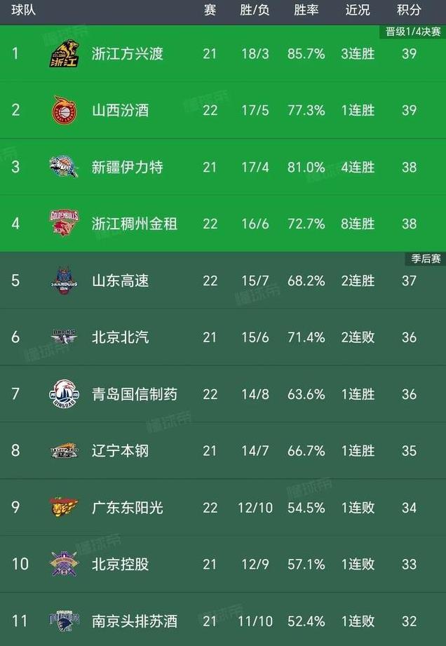 浙江队以一场酣畅淋漓的胜利,成功豪取8连胜,稳固了自己在联赛前四的位置。而广东队则在主场迎战浙江队的比赛中,尽管4人得分上双,但最终还是不敌对手,排名下滑至第9位。,上海队则凭借出色的表现,轻取福建队,豪取9连胜,顺利进入季后赛区。另外,青岛队在主场复仇天津队的比赛中,出了强大的实力,以123-95的比分大胜对手,排名升至第7位。
