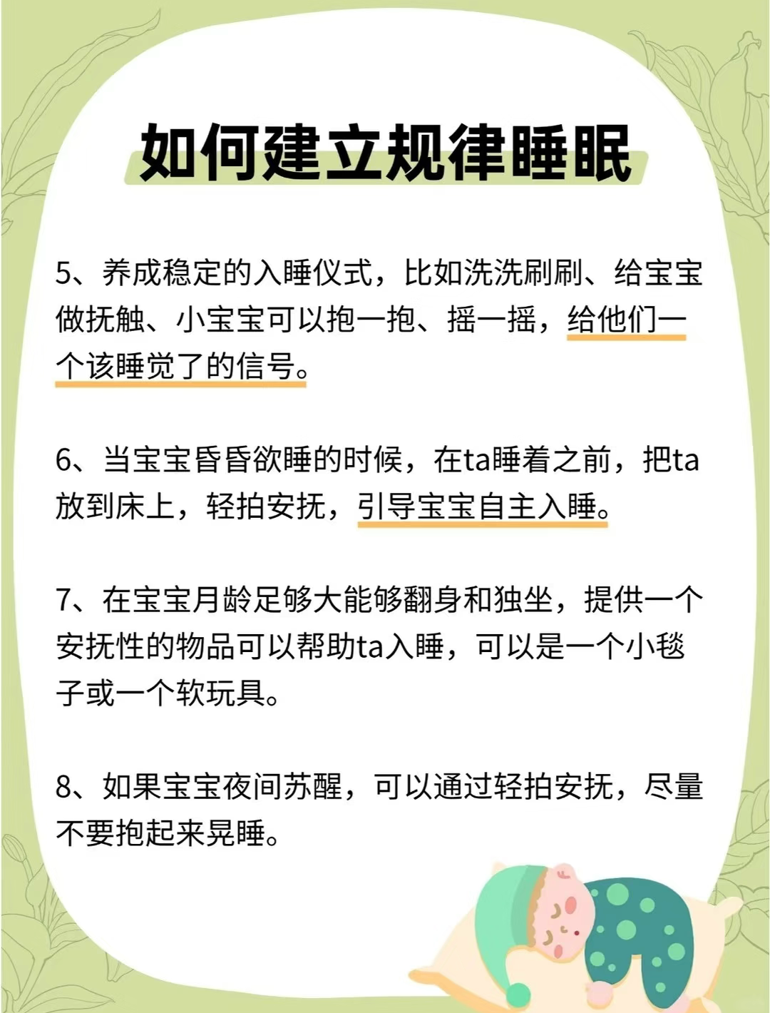 面对这场突如其来的睡眠风暴,我们能做些什么来平稳度过呢?最重要的就是放平心态,告诉自己这是宝宝成长中的一段插曲,通常只会持续几周,最多一个月,它就会自己悄悄过去。你要做的不是去打败它,而是陪宝宝一起适应它。白天的时候,可以多消耗一下宝宝无处安放的精力,陪他多趴一趴,做做抚触,跟他多说说话。到了晚上,要尽量保持原有的睡前仪式,洗澡、讲故事、喂奶、关灯,让规律的信号提醒宝宝该睡觉了。当他夜里醒来哭闹时,不要立刻就抱起来,可以试着先轻轻地拍一拍,发出“嘘嘘”的声音安抚他,给他一点自我安抚的时间和空间,也许他自己扭两下又能接上觉。如果他实在哭得厉害,需要你抱起来安抚,那也没关系,给他足够的安全感,等情绪稳定了再试着放下。