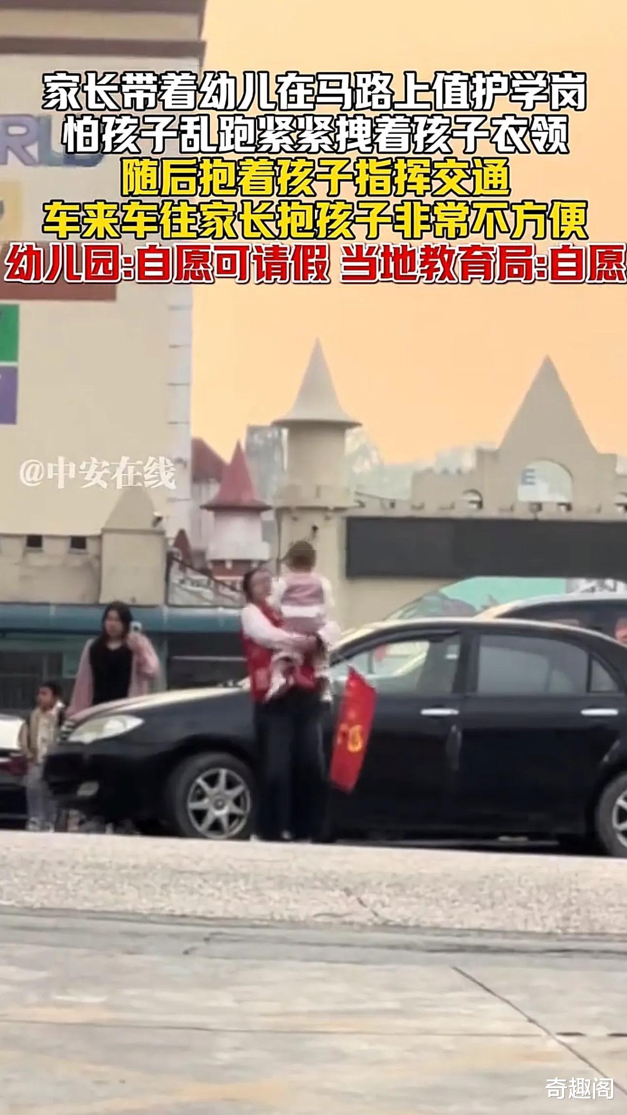 在执勤期间,这位家长的主要精力似乎被身边的孩子占据。她先是紧紧拽着孩子的衣领,担心孩子乱跑,后来可能是出于安全或者方便的考虑,干脆直接将孩子抱了起来。她手中还握着一面用于指挥的小旗,但是抱着孩子进行交通疏导,动作显然很不顺畅。