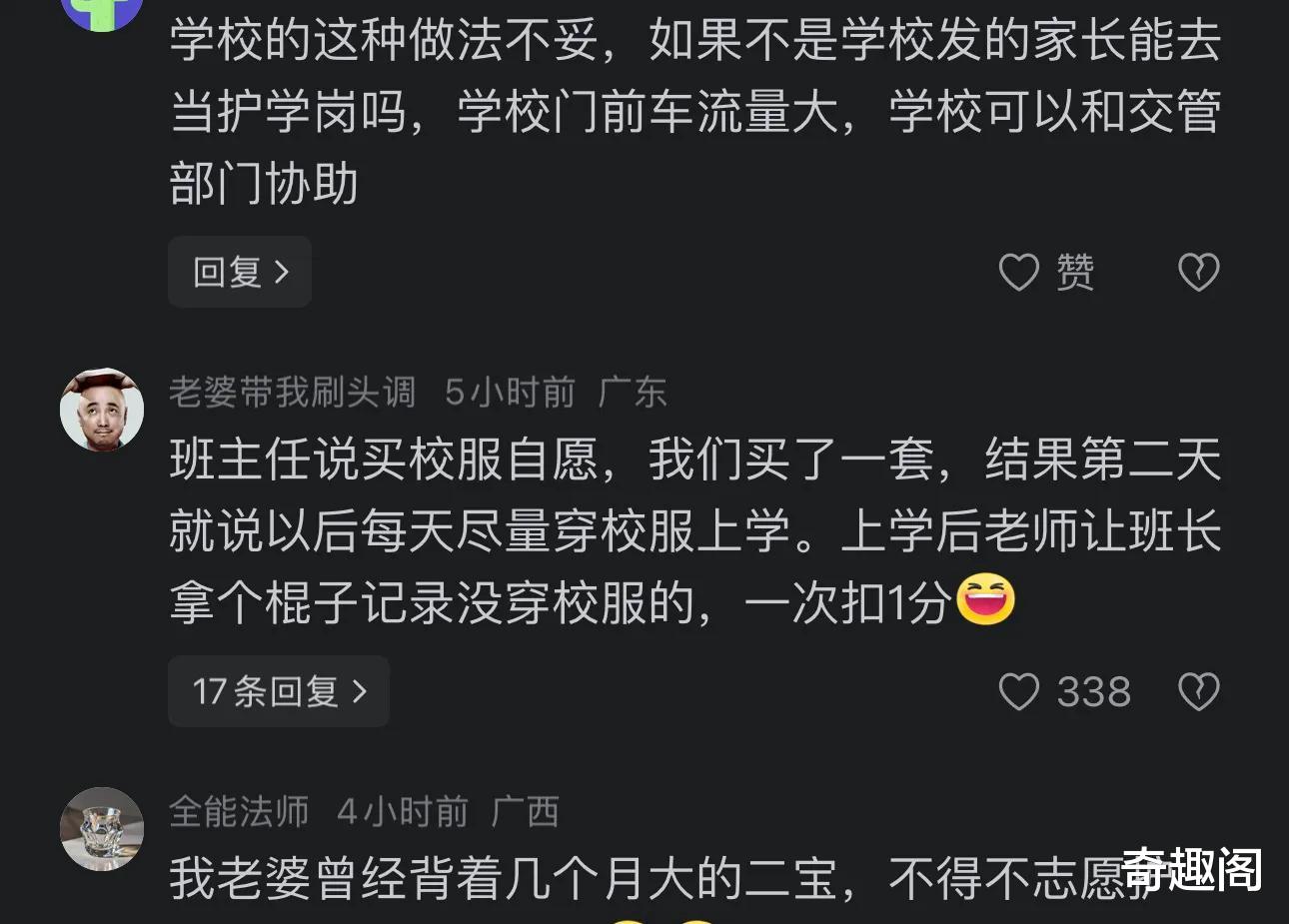 所以,我非常不理解,难道家长都这么清闲吗?如果真的有时间,这位家长何必带着孩子参加护学岗?对于这件事情,很多网友也是纷纷展开热议,发表各自的看法和意见。一位网友说,别再说谎了,根本不是自愿;还有一位网友称,明面上是自愿,但是家长若不去,老师好学校领导都会不高兴。