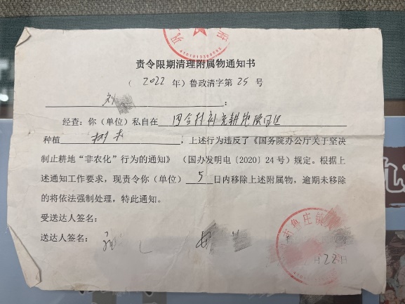 2022年2月22日,镇政府向刘先生送达《责令限期清理附属物通知书》,称其种植行为违反“耕地非粮化”管控政策(依据国务院相关文件),要求5日内清除树木。因刘先生未主动配合,当年3月11日,镇政府组织人员强制清除全部五角枫。刘先生本就是贫困家庭,出于脱贫的美好期望才做下种植决定,而现下面临的清除困境,将他再次推入泥潭之中。