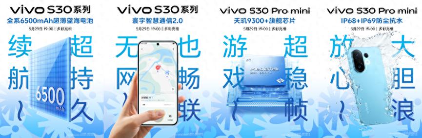 除了氛围感人像外,还有包括全系 6500mAh 超薄蓝海电池,以及全系将搭载的寰宇智慧通信 2.0,无网通信也安排上了。同时,官方还特别提到了 vivo S30 Pro mini 将搭载天玑 9300 + 旗舰芯片,以及具备 IP68+IP69 级防尘抗水。优秀的性能加上出众的防护,相信 vivo S30 系列将会为用户带来旗舰级别的使用体验。