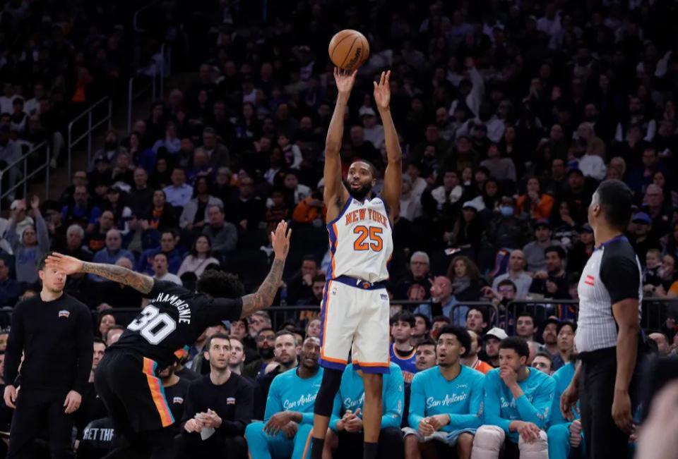 杰伦·布伦森与米卡尔·布里奇斯双核稳定输出,带动全队6人得分上双。更重要的是,他们通过持续压迫式防守破坏了马刺的传导节奏,让对手难以形成熟悉的空间推进体系。