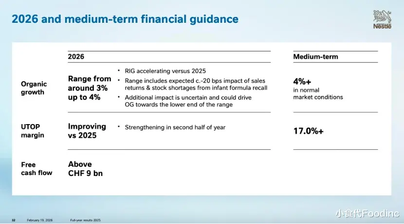 对于本次奶粉召回的“经济账”,雀巢首席财务官Anna Manz今天指出,召回主要发生在2026年,但涉及的是2025年销售的产品。因此,在2025年的业绩中已经包含了客户退货和库存注销的估计影响。对基础交易营业利润率(UTOP)的影响为7500万瑞士法郎(折合约6.49亿元人民币),或者说使UTOP下降了近10个基点。