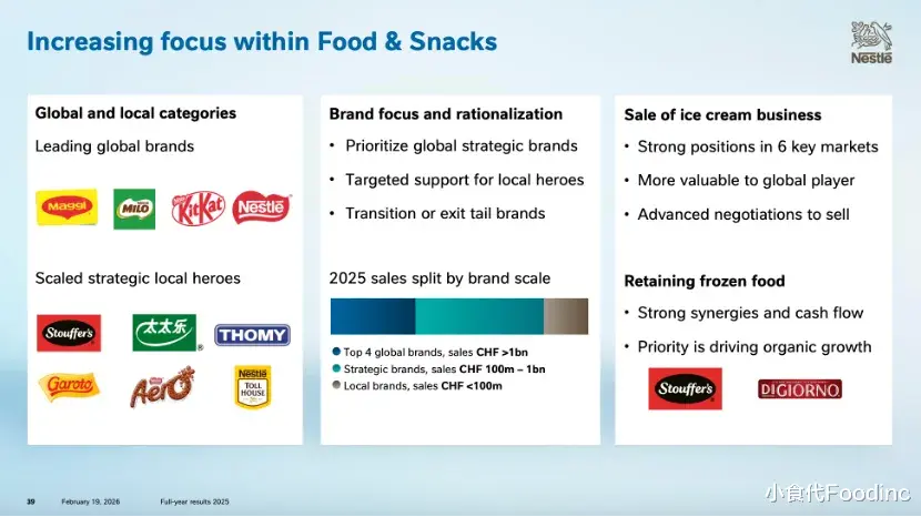 雀巢认为,前三大业务均属于真正的全球品类,并拥有领先的市场地位,总计约占集团销售额的70%。食品与零食属于区域性业务,雀巢在该领域同样拥有领先的全球与本地品牌。这些业务在增长、回报、市场地位与业绩表现等方面均属于“制胜业务”。