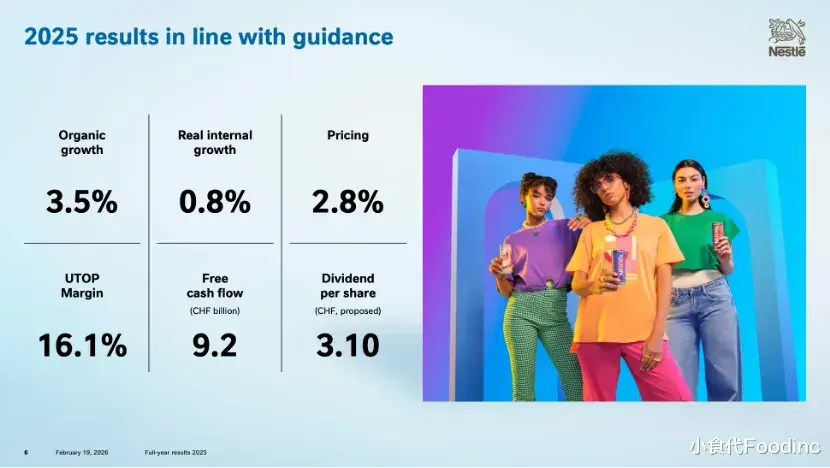 外界对于新帅任内交出的第一份年报,给予高度关注。华尔街日报今天指出,雀巢2025年有机销售额增速加快至3.5%,高于分析师预期的3.4%;销售额为894.9亿瑞士法郎(1157.5亿美元),分析师此前预期为896.9亿瑞士法郎。