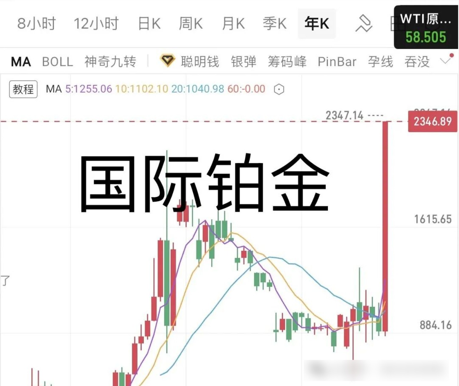 现货铂金已经拿下历史新高,并且来到了2300美元以上,在市场出现高点前上方看不到任何阻力;钯金一样大涨,并突破2023年以来新高,今天广期所铂金钯金期货将冲击涨停,不过因交易调高涨跌停幅度,涨停难度!目前,距离最近我们发布看好铂金钯金牛市继续的视频之后,这两个产品已经大涨30%以上!