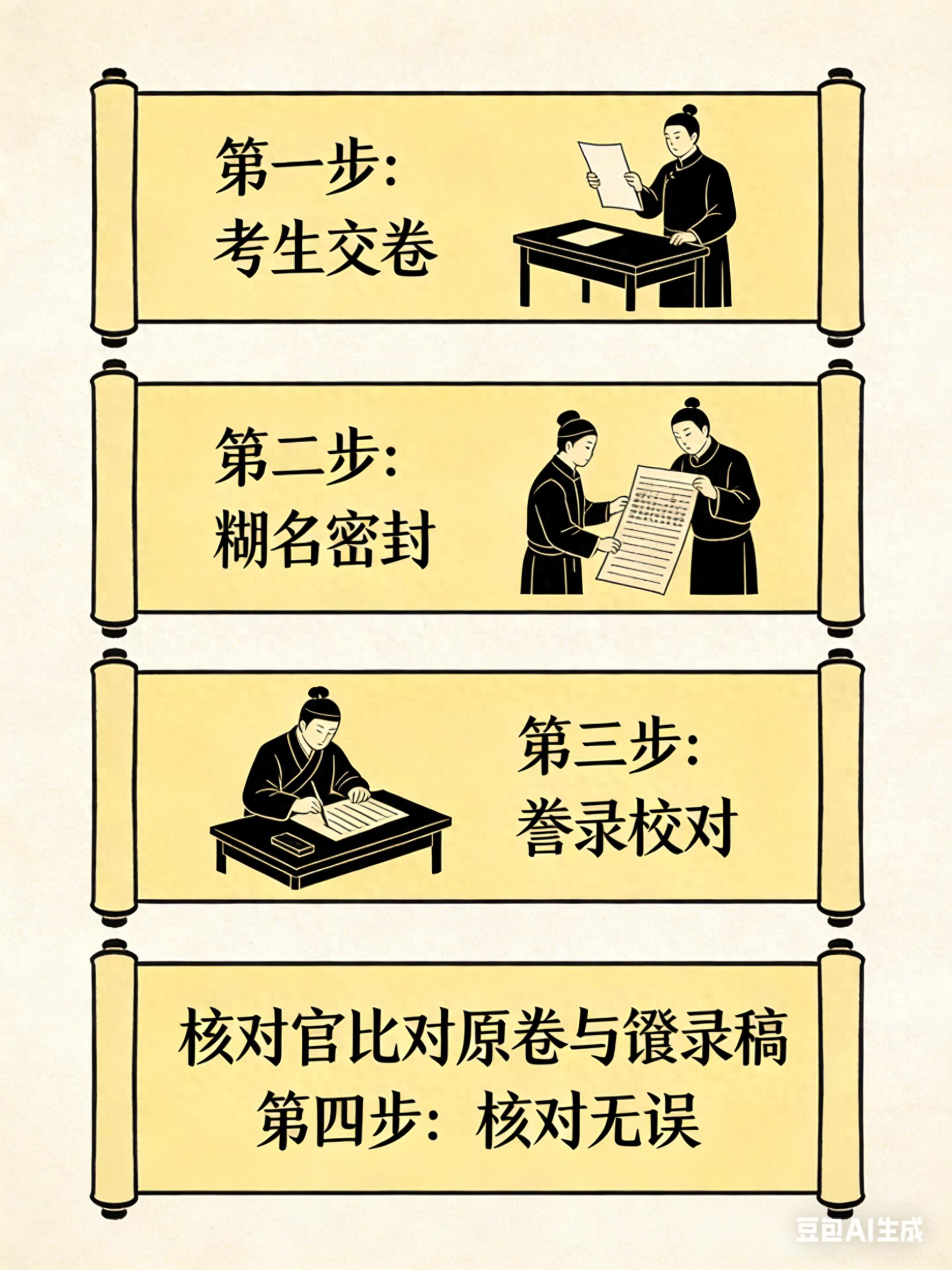 糊名、誊录制度化(宋真宗景德二年定型),考官不见姓名、笔迹,杜绝徇私;三年一考、大规模扩招,寒门子弟稳定入仕。