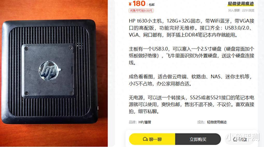 我刷到的是这台HP t630小主机,卖家要价180块包邮。给的是准系统,带了块128G和32G的固态硬盘,还贴心地送了个转接线,能自己加个2.5寸的硬盘。