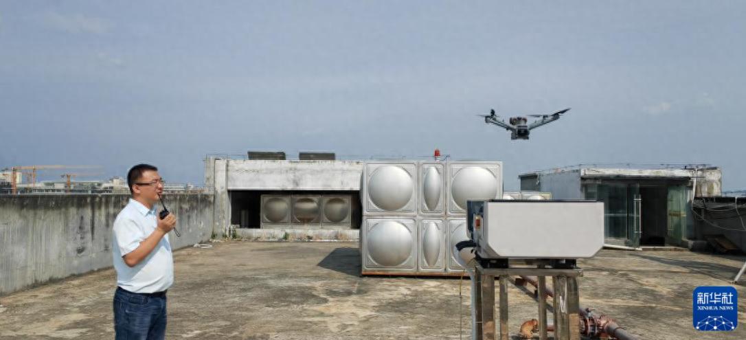 在蒙自市城区的一处楼顶,工作人员正在指挥远程操控无人机。新华社记者浦超 摄