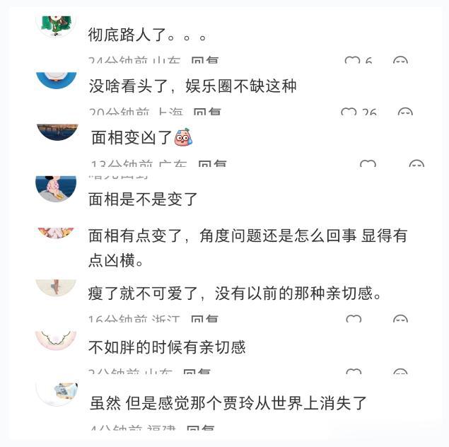 不管贾玲现在像谁,网友们普遍看出来了,贾玲的面相变了。有的说彻底变成路人了,没有看头了;有的说面相变凶了,没有之前的亲切感了;还有的说,感觉从前那个贾玲从世界上消失了~