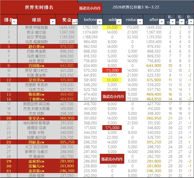 世界公开赛结束后,最新的世界排名也出来了。世界前8名没有什么变化,还是特鲁姆普、凯伦·威尔逊、尼尔·罗伯逊、马克·威廉姆斯、赵心童、希金斯、塞尔比和肖恩·墨菲这几位。肖国栋升到了第9位,奥沙利文也升到了第10位,霍金斯跌到了第11,吴宜泽降到第12,斯佳辉升到第15。