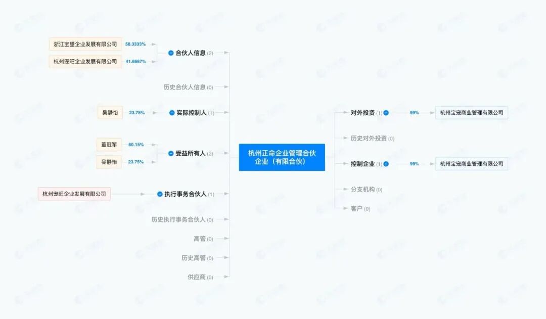 另外,杭州正命企业99% 控股杭州宝宠商业管理有限公司,形成“商标持有-运营管理”的关联架构。朱佳嘉虽未直接持股,但通过女友吴静怡及执行事务合伙人杭州宠旺实现对公司的实际控制,为资金挪用、违规操作提供了制度漏洞。