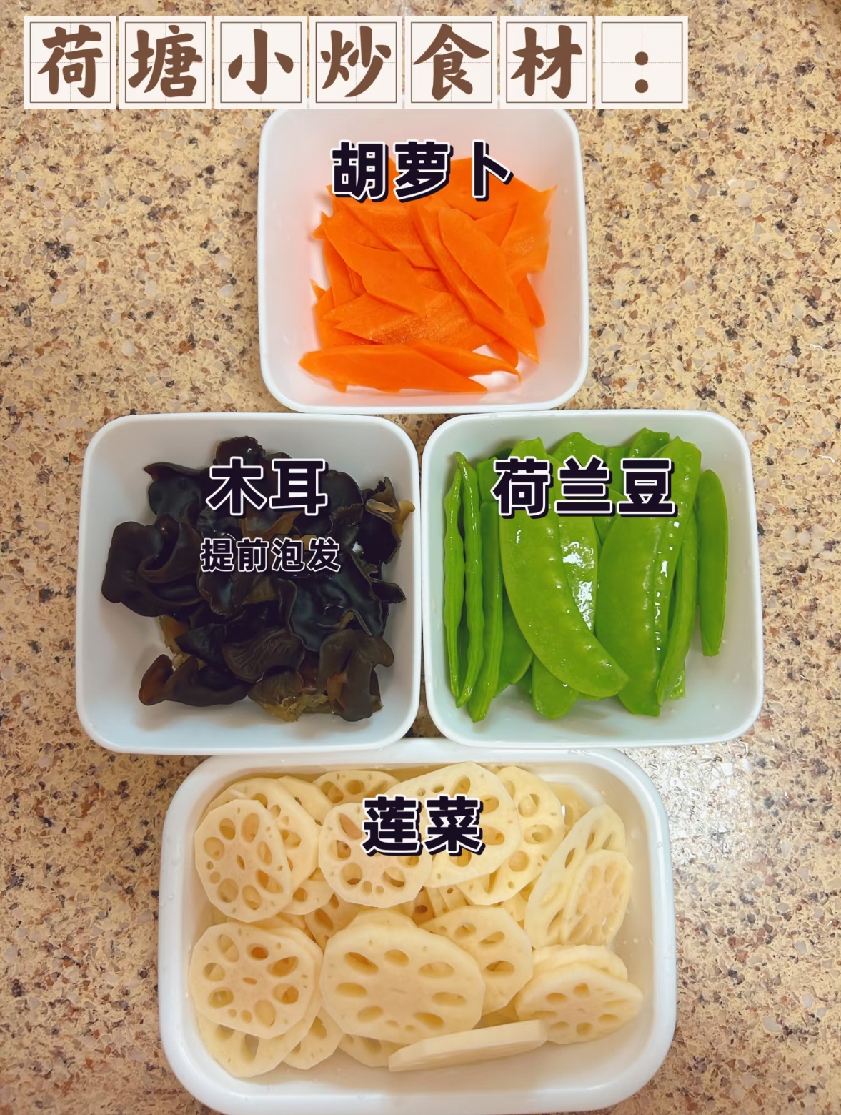 - 主料:莲藕一节、荷兰豆150克、干木耳10克、胡萝卜半根。