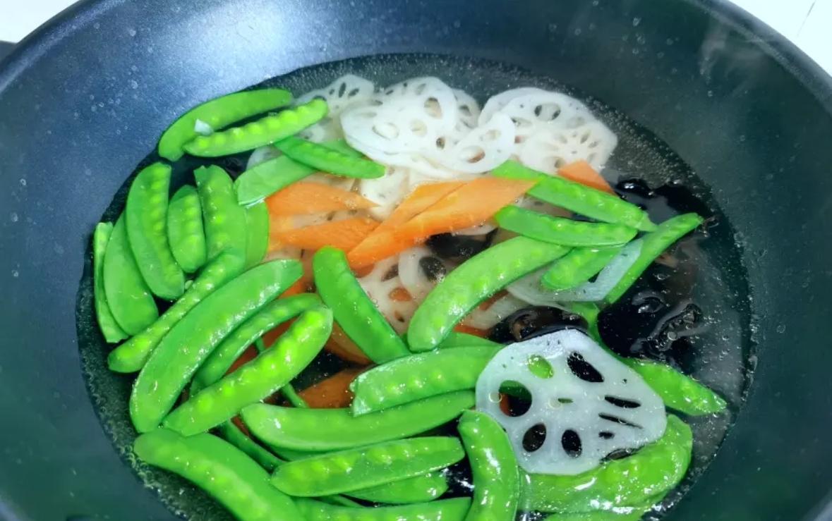 2.焯水预处理:锅中烧开水,加入少许盐和食用油。先放入莲藕片焯水约40秒,再依次加入胡萝卜片、荷兰豆和木耳,焯水时间不宜过长,约1分钟即可。捞出后迅速过冷水,沥干水分备用。这一步能保持蔬菜的色泽和脆嫩口感。